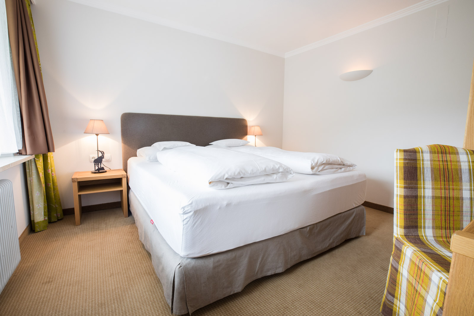 Suite mit getrenntem Wohn-Schlafraum mit Couch, Bad mit Badewanne, WC, grosser Eck-Balkon.